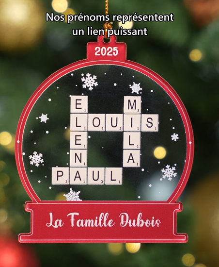 Cet ornement noel personnalisé en acrylique est conçu autour du motif boule à neige enrichi de mots croisés, avec l’option d’y inscrire le nom de la famille ou des prénoms. L’impression durable garantit un rendu clair et résistant.