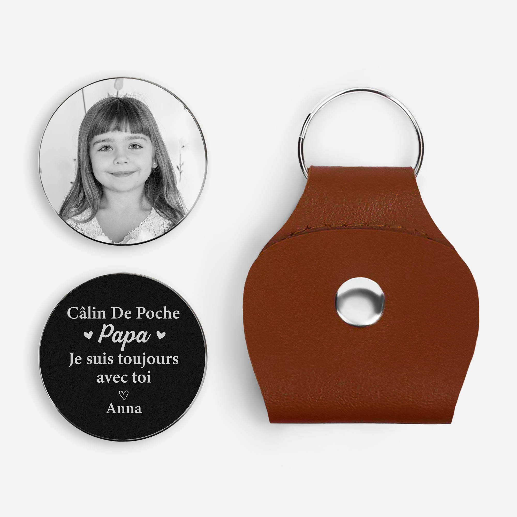 - Câlin de poche personnalisé : Ce charmant câlin de poche en cuir PU présente un extérieur élégant au format porte-clés, facile à emporter partout. À l’intérieur, un jeton rond en acier inoxydable peut être personnalisé grâce à une impression UV sur les deux faces avec un prénom, un message ou un motif unique pour une touche personnelle et pleine d’émotion.