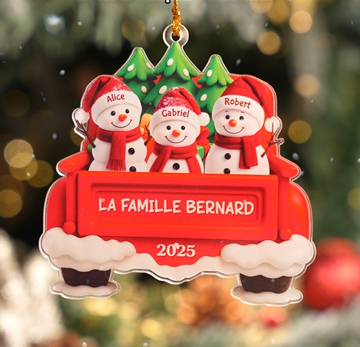 [Effet d'impression 3D] Ornement Noël Acrylique Personnalisé - Famille Bonhomme De Neige Avec Voiture