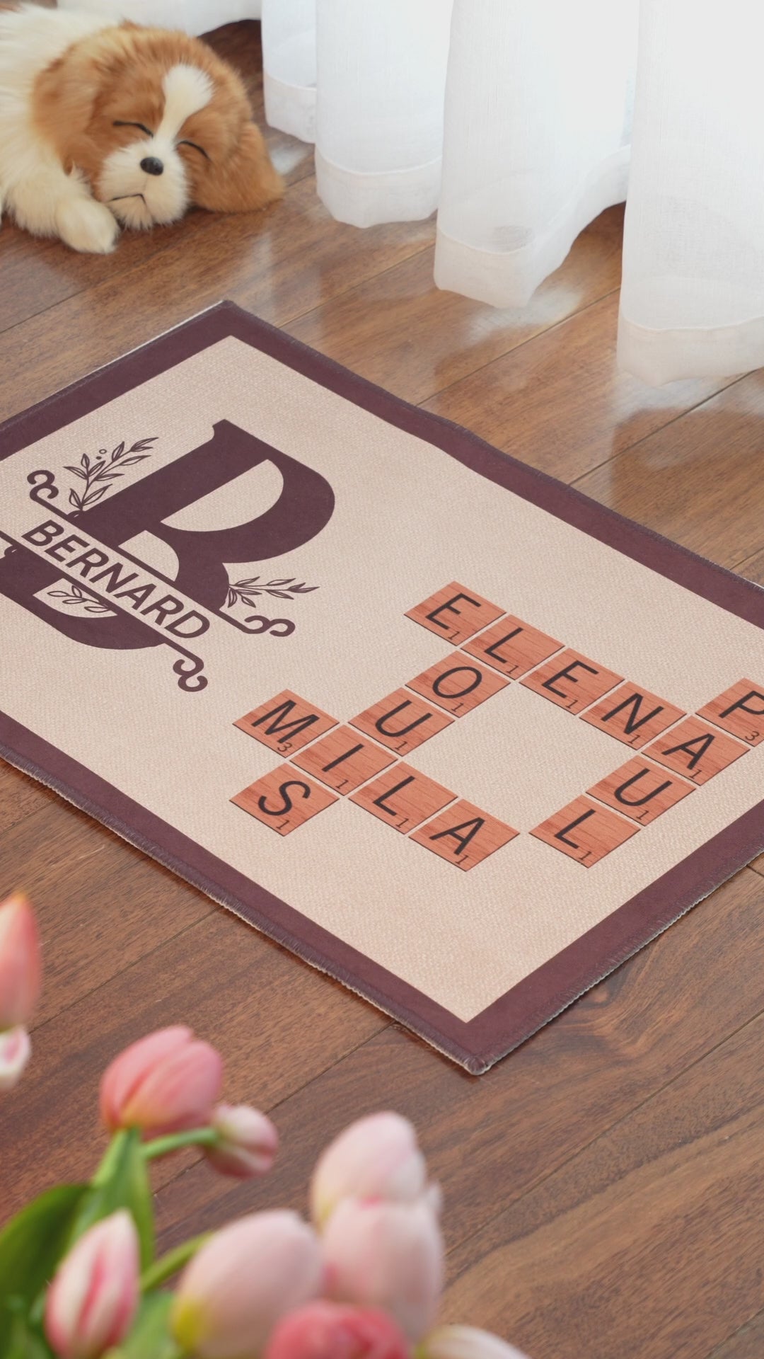Accueillez vos invités avec originalité grâce à ce paillasson famille personnalisé, intégrant vos initiales et une grille inspirée des mots fléchés. Un clin d'œil affectueux dès le pas de la porte.