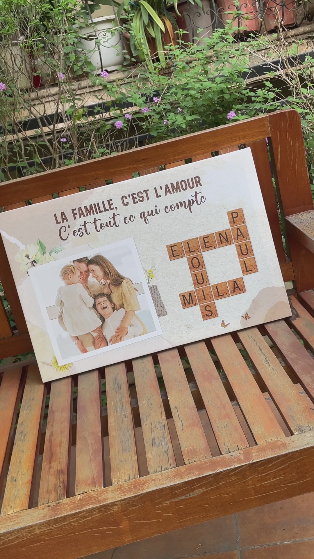 Transformez vos plus beaux souvenirs en une œuvre murale unique grâce à cette toile avec photo et mots croisés personnalisés. Chaque mot choisi représente un lien, une émotion, une histoire partagée : un mot qui représente la famille, une date importante ou un prénom cher. Cette toile personnalisable pour famille est idéale comme cadeau de cœur pour un anniversaire, Noël ou la fête des grands-parents.