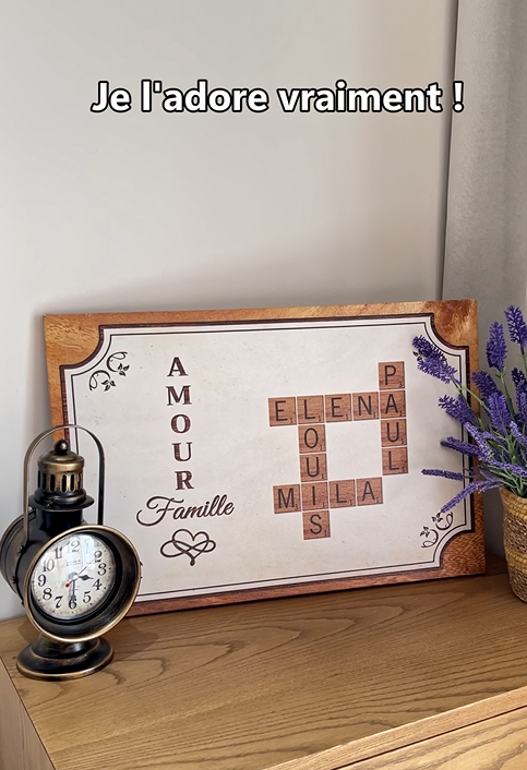 Cette toile rassemble les prénoms de vos proches dans un mot croisé personnalisé, illustrant la richesse des liens familiaux. Le design est accompagné d’un message doux qui renforce la symbolique.