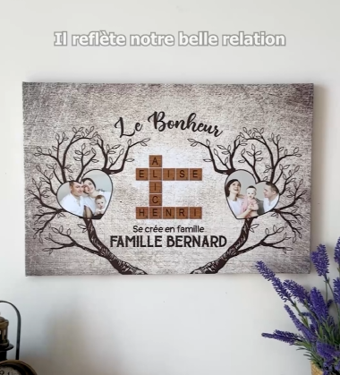 Ce tableau incarne l’idée que le bonheur se crée en famille. Vos prénoms sont disposés dans un design harmonieux, inspiré des mots croisés personnalisés.