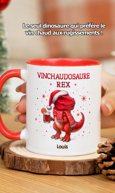 Ce mug de Noël personnalisé allie humour, passion du vin et univers préhistorique. Le motif “Vinchaudosaure Rex” rendant chaque tasse unique et pleine de caractère.