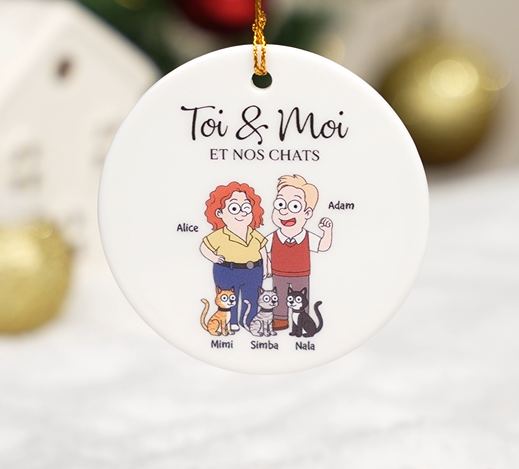 Ornement de Noël Personnalisé Céramique - Couple Toi & Moi et le Chat