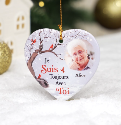 Cet ornement de Noël personnalisé est un cadeau pour rendre hommage aux êtres chers. Conçu pour réchauffer les cœurs pendant les fêtes, il garde leur souvenir vivant et apporte une touche d’émotion unique à votre sapin. Plus qu’une décoration, c’est un symbole d’amour éternel et de réconfort.
