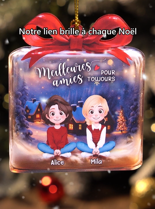 Cet ornement de Noël est un cadeau tendre et original, idéal pour surprendre vos amis pendant les fêtes. Plus qu’une simple décoration, ce cadeau meilleure amie personnalisable devient un souvenir inoubliable, symbole d’une amitié qui dure pour toujours.
