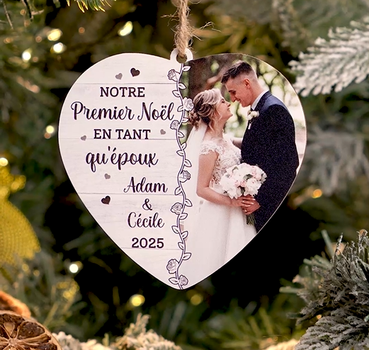 Ajoutez une touche d’amour à votre sapin avec cet ornement de Noël personnalisé. Conçu pour les couples qui veulent immortaliser leurs plus beaux moments, cet ornement en bois allie charme rustique et émotion sincère.