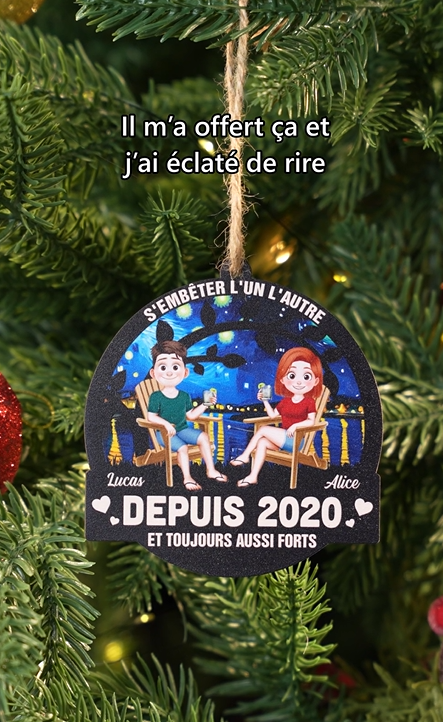 Cet ornement personnalisé est une idée pleine de charme et de complicité, parfait pour célébrer l’amour au sein d’un couple. Un choix idéal pour Noël, il devient un symbole d’affection et d’humour, à accrocher fièrement au sapin. C’est également l’un des cadeaux originaux pour couple homosexuels les plus touchants à offrir.