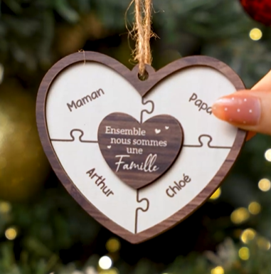 Cet ornement de Noël personnalisé est le cadeau idéal pour symboliser l’unité familiale. Ce cadeau puzzle bois reflète les liens d’amour et apporte une touche chaleureuse à votre sapin. Parfait pour Noël ou comme souvenir intemporel à partager en famille.