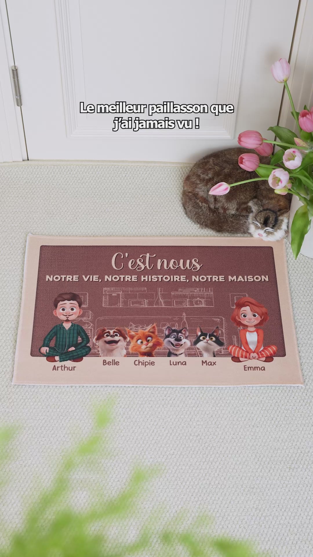 Le paillasson personnalisé chat "C’est nous" en dessin animé 3D transforme votre entrée en une scène chaleureuse et ludique, parfaite pour afficher en toute convivialité l’amour que vous portez à vos compagnons à quatre pattes.
