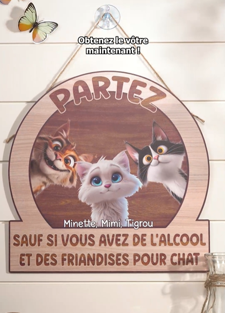 Offrez une touche d’humour et de tendresse avec cette plaque en bois personnalisée avec chat. Parfaite pour les foyers où le chat est roi, elle s’accroche facilement à la porte ou au mur pour accueillir vos invités avec style.