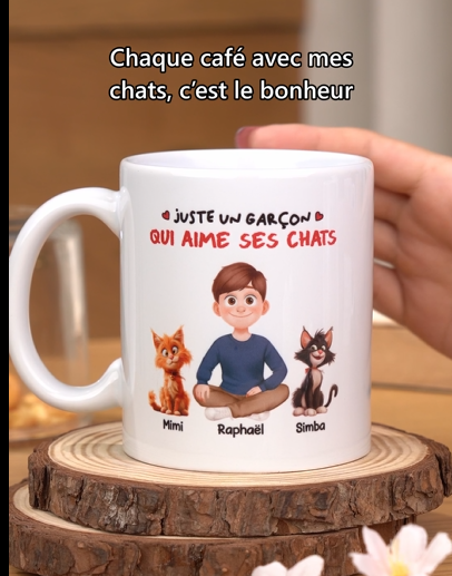 Une tasse avec chat personnalisé à offrir à une sœur, une amie ou une collègue cat lover. Ajoutez un prénom et une courte phrase pour un cadeau léger et quotidien.