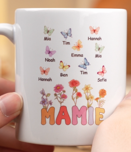 Ce mug personnalisé grand-mère illumine ses pauses café avec un design vif et poétique de fleurs et papillons colorés. À personnaliser avec prénoms, il convient à une mamie douce, joyeuse et toujours attentive.