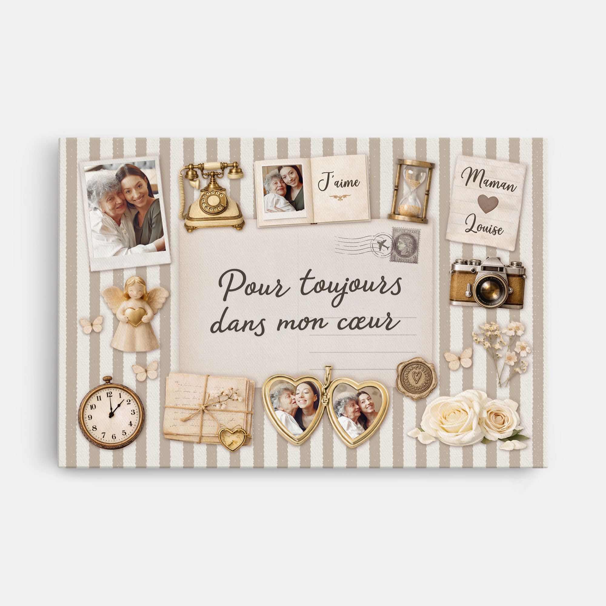 Mêlant émotion et esthétique, cette toile imprimée personnalisée permet d’immortaliser le visage d'une maman ou d'une mamie partie trop tôt. C'est un cadeau de soutien précieux pour un proche en deuil ou un ajout réconfortant à votre décoration lors d'occasions spéciales comme la fête des mères.