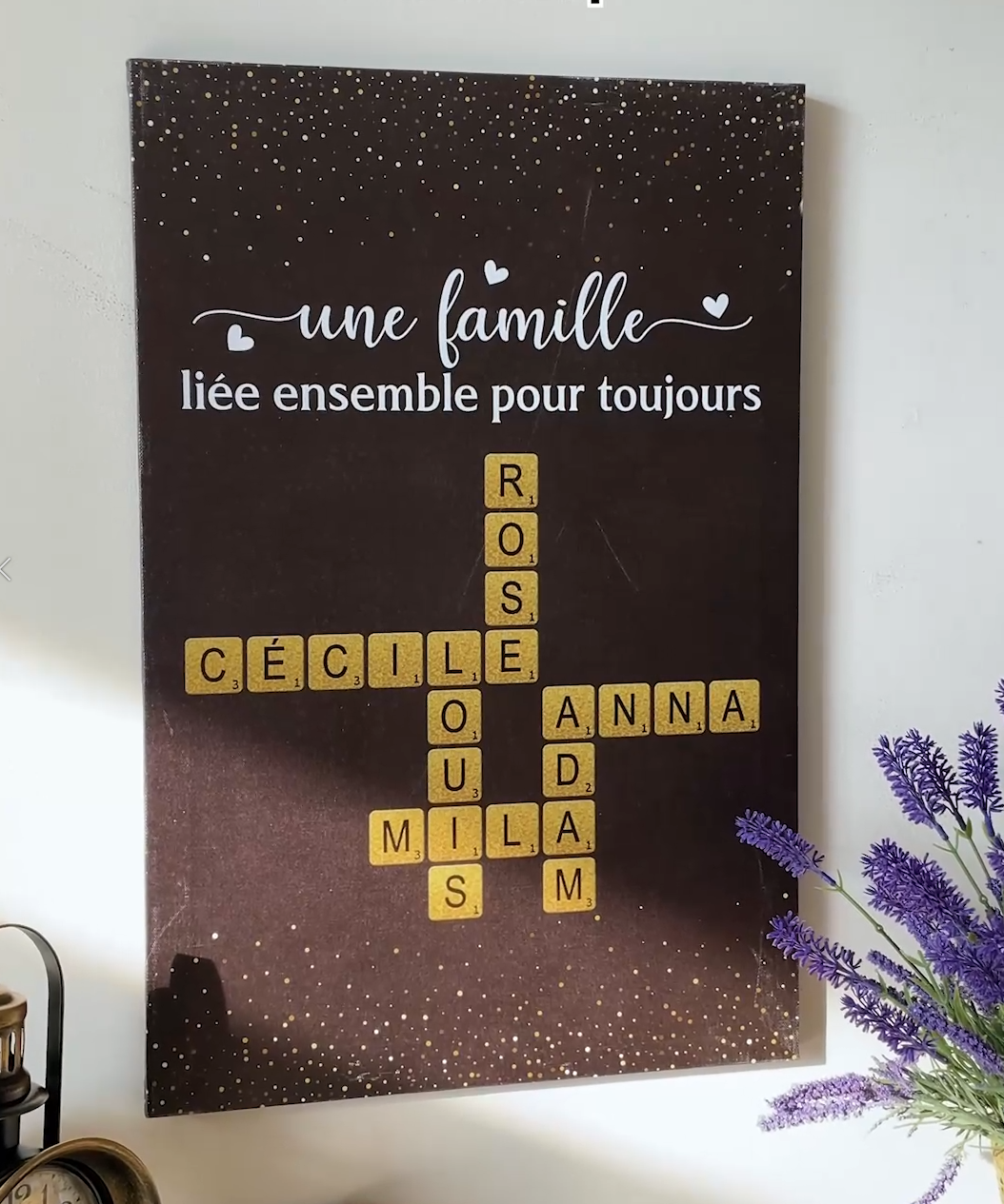 Cette toile est une ode à l’unité familiale, avec une grille de mot croisé prénom famille entourée d’un message doux : “Ensemble pour toujours”. Parfaite pour affirmer les liens d’une tribu aimante.