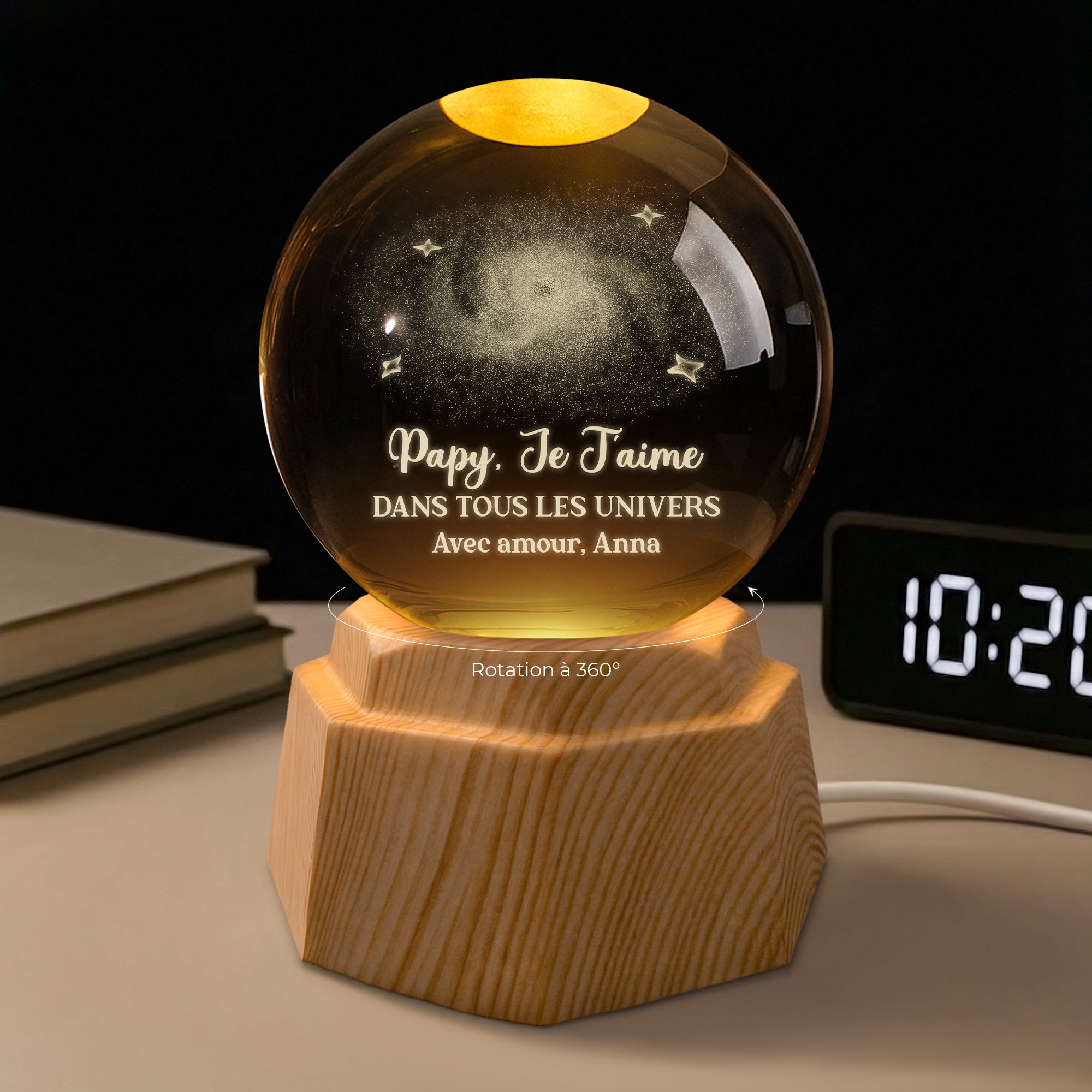 - Matériaux haut de gamme : Fabriquée en cristal K9 de haute qualité, reconnu pour sa transparence et son éclat exceptionnels. La base LED en plastique effet bois est légère, stable et permet une rotation fluide à 360° pour admirer la gravure sous tous les angles.