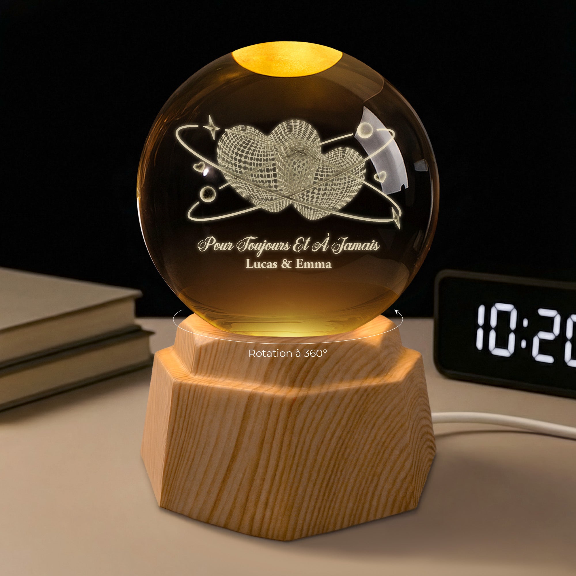 Ajoutez une touche de passion avec cette Veilleuse Boule De Cristal Personnalisée aux cœurs gravés.